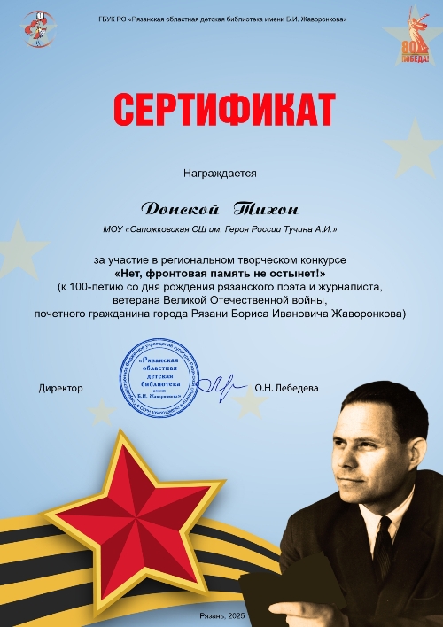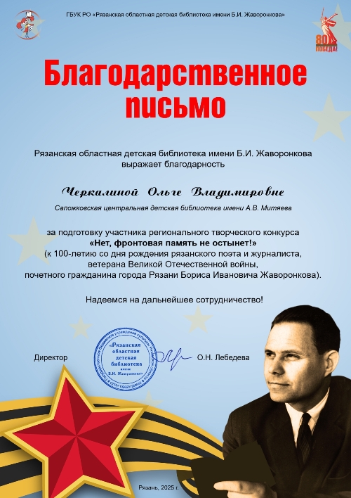 Центральная детская библиотека им. А.В. Митяева приняла участие в региональном творческом конкурсе "Нет, фронтовая память не остынет!", посвященном 100 - летию со дня рождения Бориса Ивановича Жаворонкова. Организатором Конкурса является Государственное бюджетное учреждение культуры Рязанской области «Рязанская областная детская библиотека им. Б.И. Жаворонкова».